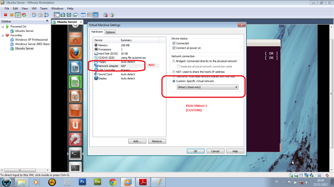 14. setelah itu , settinglah network yg kita gunakan pada VMware. yg awalnya NAT ubahlah menjadi custom vmnet 1.